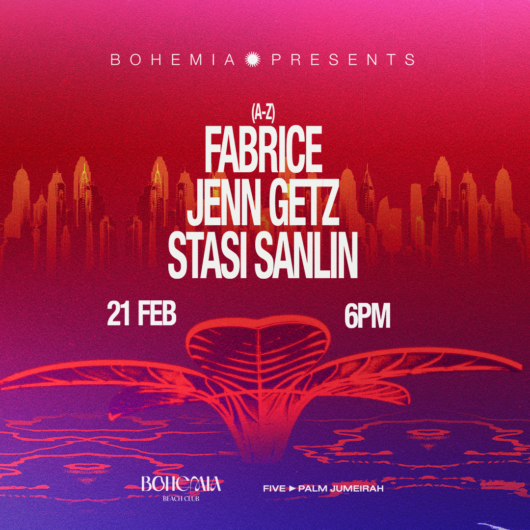 This February, Bohemia Presents welcomes Fabrice, Jenn Getz, and Stasi Sanlin for a refined Saturday soundtrack on Dubai’s most iconic beachfront. From the first notes at sunset to the final track late into the night, expect a seamless journey through melodic house, deep grooves, and immersive rhythms.